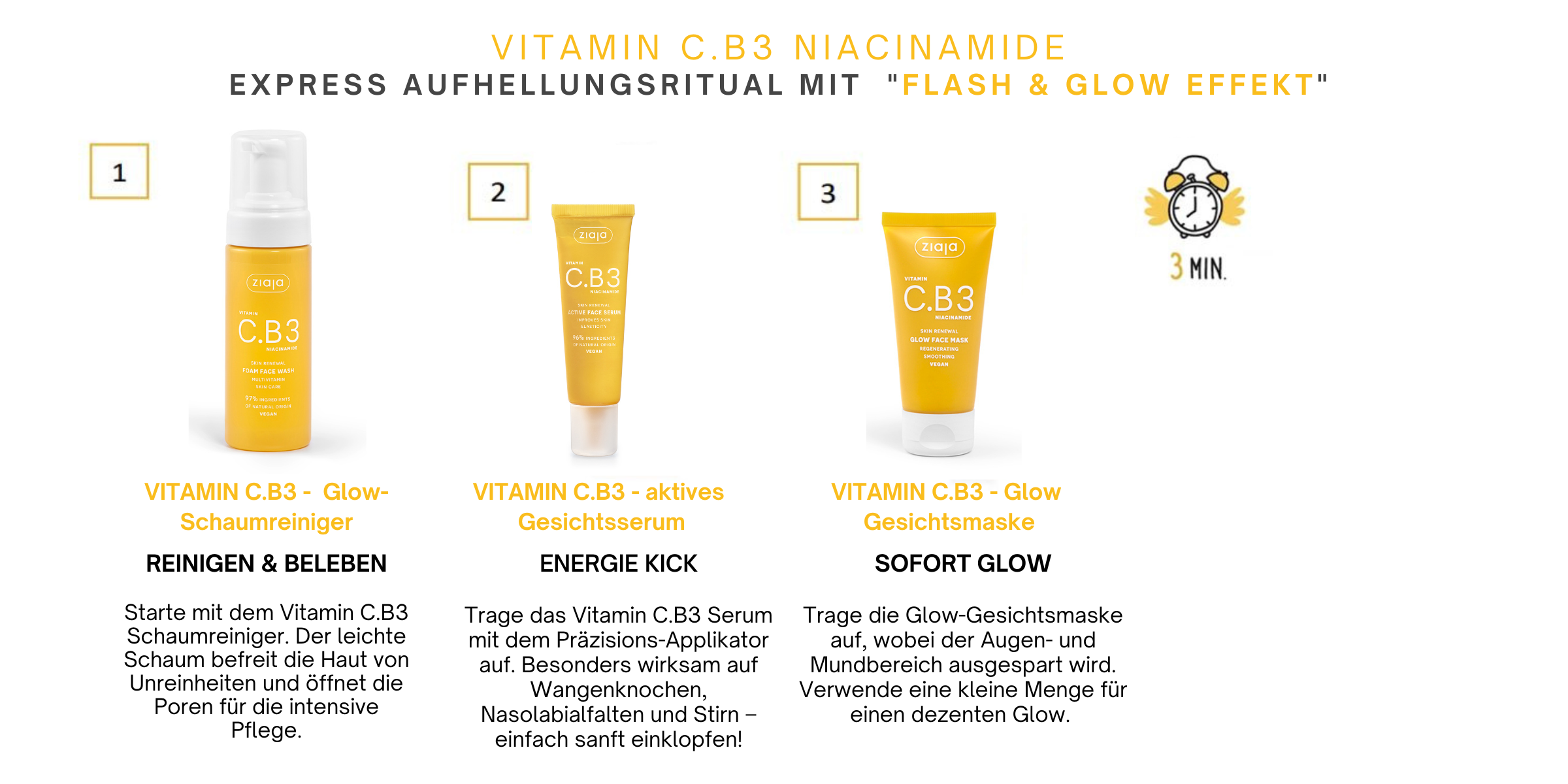 Verwandle deine Morgenroutine in ein strahlendes Beauty-Erlebnis mit dem Ziaja VITAMIN C.B3 NIACINAMIDE Flash & Glow Express Brightening-Set.
